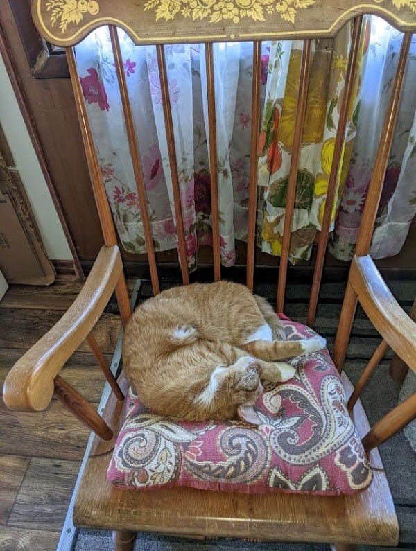 Jeoffry takes over the rocking chair. Fur-fur on the cushion.